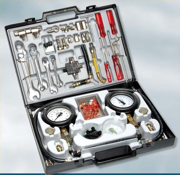 Koffert med innhold til lavtrykksmålinger på bensinsystemer.