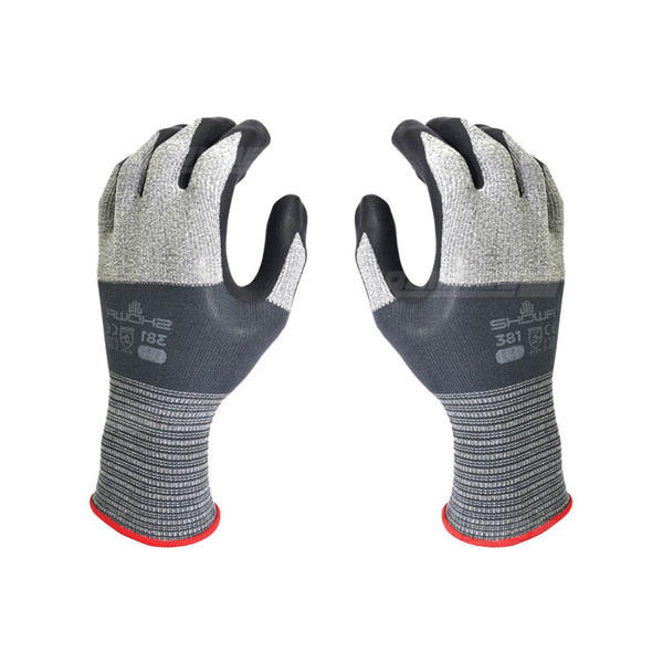 Showa 381 gir deg et optimalt grep på oljete/glatte overflater, meget komfortabel og med dobbelt så sterk slitestyrke som Showa 380. Slitestyrke 4.  Sømløs strikket Microfiber med nitrilbelegg i håndflaten.